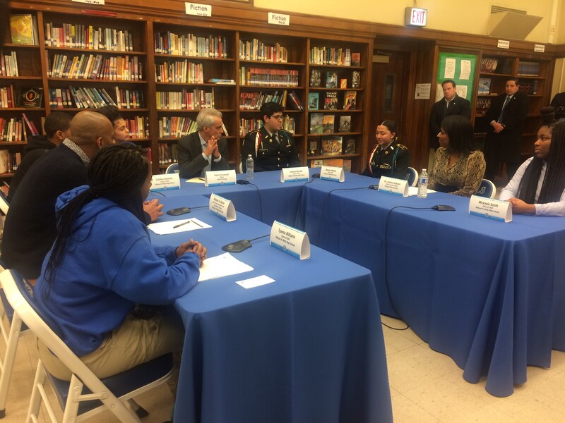 After the announcement, district CEO Janice Jackson moderated a roundtable discussion with seven students (including business-minded hooper Donald Aguirre), Horton, and Emmanuel, focused on planning for life after high school — and success. Some of the students were in JROTC and had aspirations of joining the Army or Air Force. Others wanted to be lawyers, nurses, doctors, psychologists or work with children. Several, like Aguirre, were considering business.