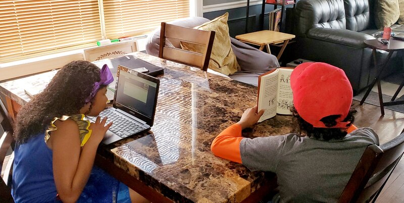 Brook and Jake Tunstill do schoolwork at their family’s kitchen table at their home on Chicago’s South Side.
