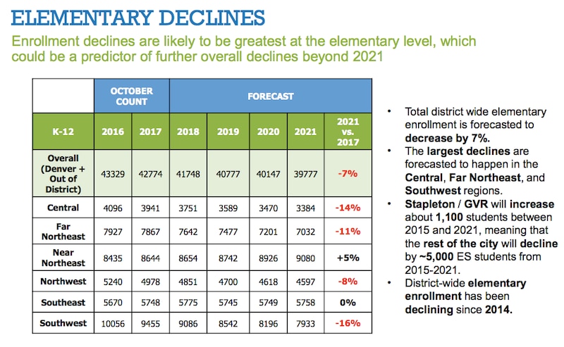 But the decrease won’t be felt in every neighborhood, it says. Some parts of the city, like the booming near northeast Stapleton neighborhood, are expected to see increases. Meanwhile, more than half of the city’s 78 neighborhoods are predicted to experience drops in enrollment. Southwest Denver, home to many Latino families, will be among the hardest hit.