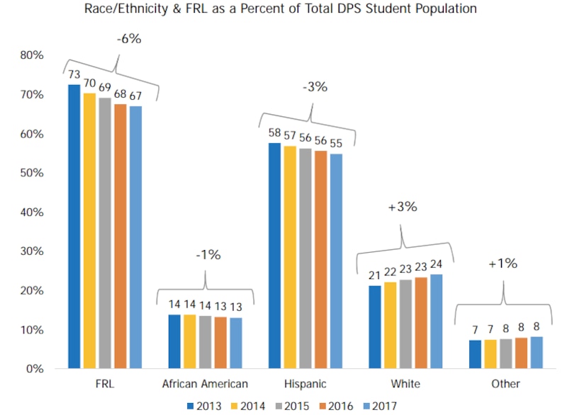 8. The overall student population in Denver Public Schools continues to get more affluent and more white. This year, the percentage of students who qualify for free or reduced-price lunch, a proxy for poverty, is down 1 percent. The percentage of white students is up 1 percent. Both changes are in line with demographic trends occurring over the past five years.
