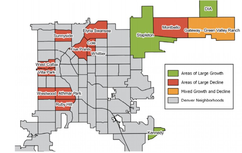 4. The neighborhoods that are expected to experience the largest enrollment declines are Montbello in far northeast Denver; Elyria-Swansea, Cole, Five Points and Whittier in central Denver; Sunnyside in northwest Denver; and West Colfax, Villa Park, Athmar Park, Westwood and Ruby Hill in southwest Denver. The district has flagged the areas for further study.