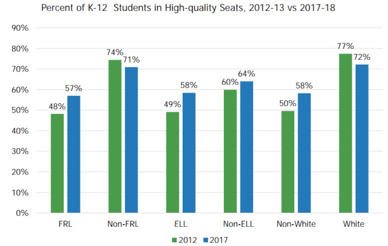 9. Low-income students, non-white students and English language learners are less likely to attend schools the district deems high quality than wealthier, white, non-English-learners. But the gaps between the percentages of less privileged and more privileged students attending quality schools has shrunk over the past five years.
