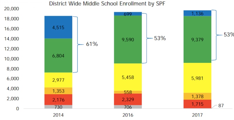 11. Districtwide, 70 percent of elementary school students are attending high quality schools, or schools rated blue or green on the district’s color-coded scale, which is an increase from last year. That percentage is lower for the upper grades: 53 percent of middle school and 48 percent of high school students attend blue and green schools. The high school percentage has stayed relatively steady over the past few years, but the middle school percentage has declined.