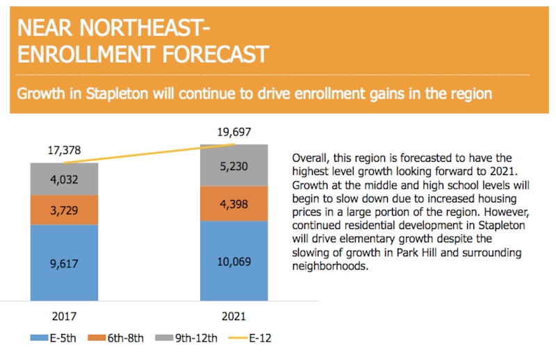 6. The near northeast region is the reverse. Due in part to continued development in the middle- and upper-income Stapleton neighborhood, it’s expected to gain the most students by 2021: more than 2,300. The biggest gains are forecast at the high school level.