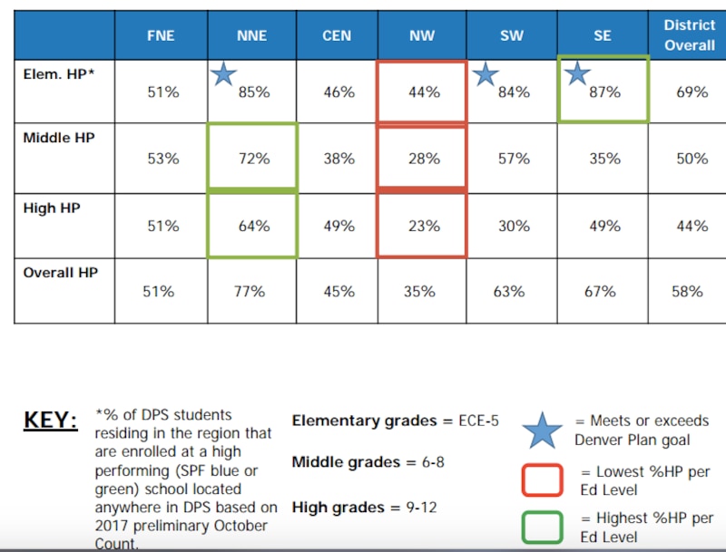 12. The district has set a goal that 80 percent of students residing in each region of the city will attend a blue or green school by 2020. While it has yet to meet that goal in any region, it has made some progress, especially at the elementary school level.