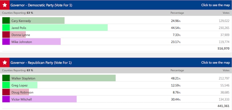 Polis took 44 percent of the vote in a four-way primary, with Cary Kennedy, a former state treasurer, coming in second with 25 percent. Former state Sen. Mike Johnston, the architect of key education reform policies in Colorado, finished third with 23 percent of the vote.